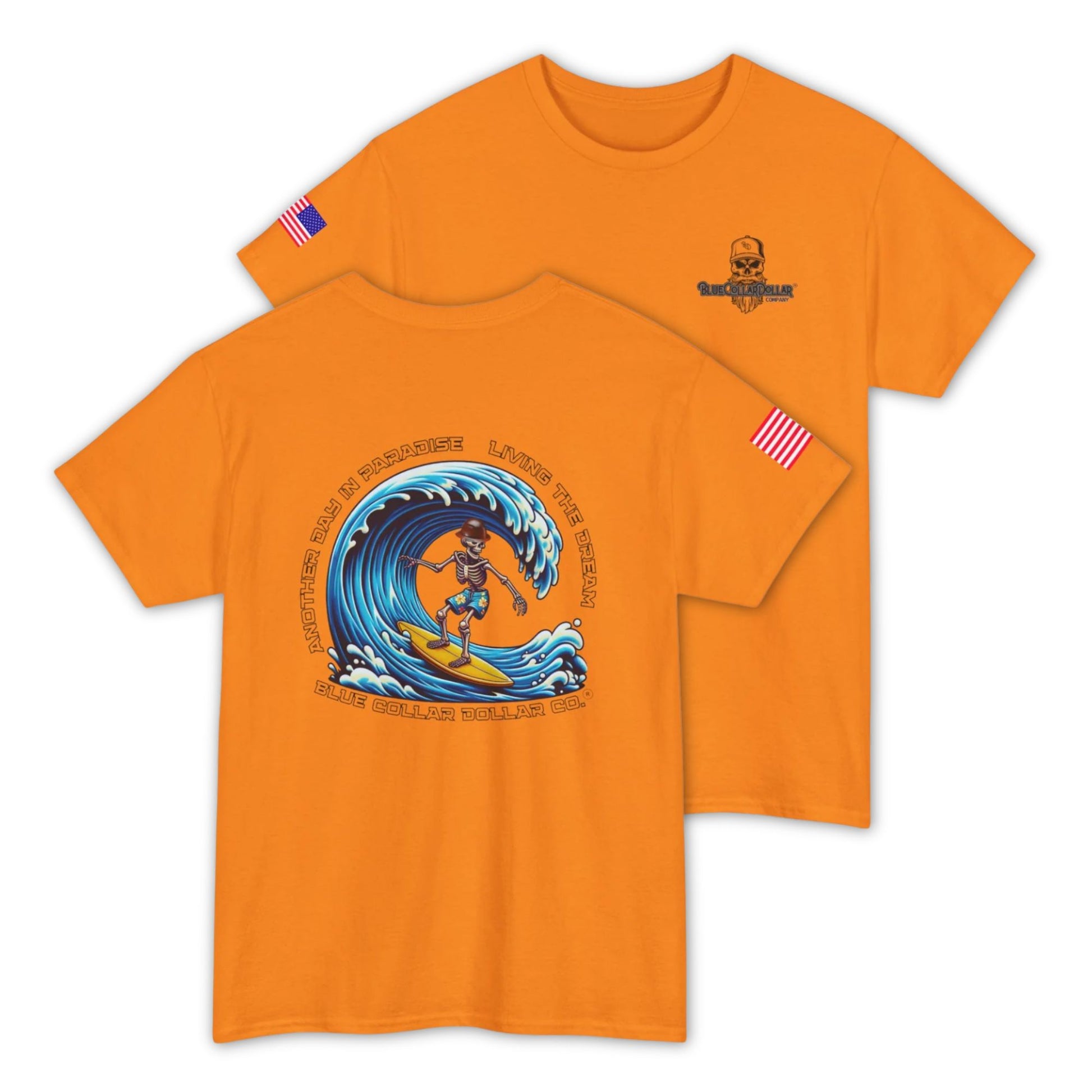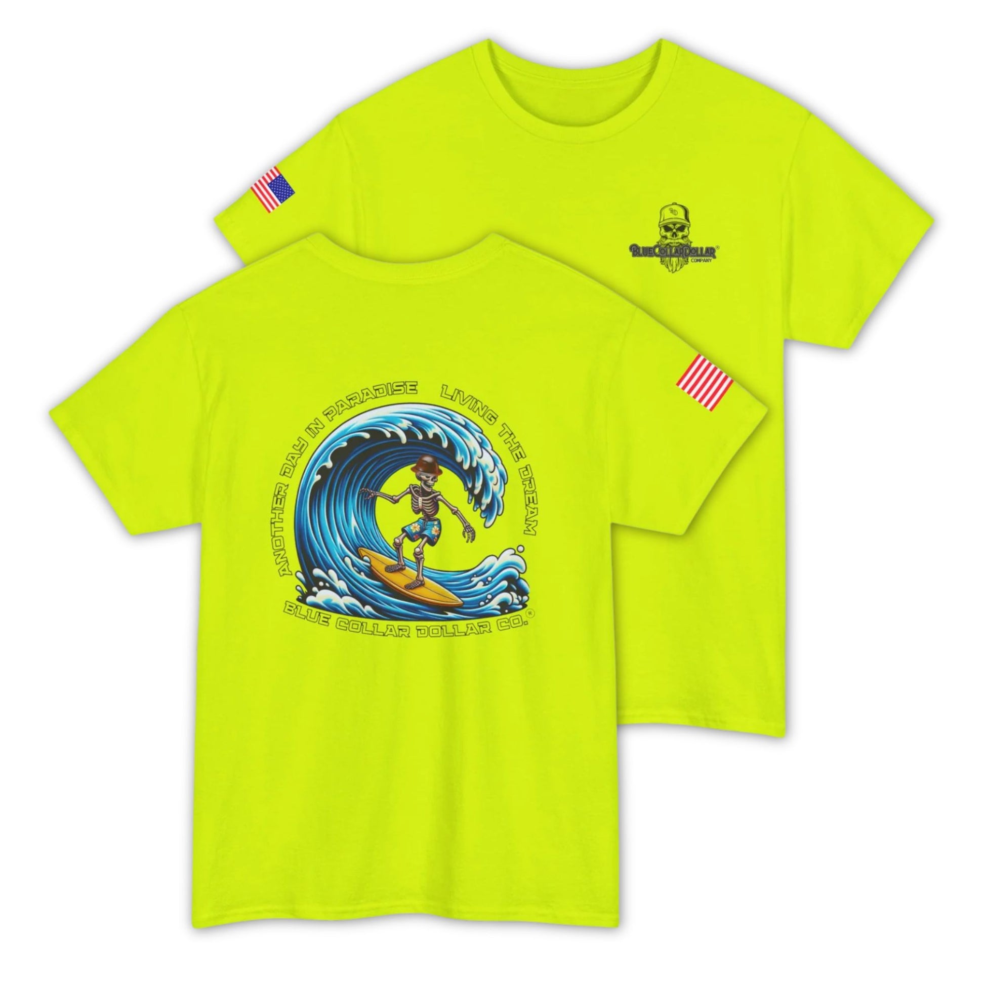 This hi-visibility beauty was made for those legendary blue-collar moments where chaos reigns but the grind doesn’t stop. Featuring a skeleton in board shorts catching a wave like he didn’t just pull a double shift, it’s perfect for showing your crew you can handle the mess with grit, humor, and a little style.