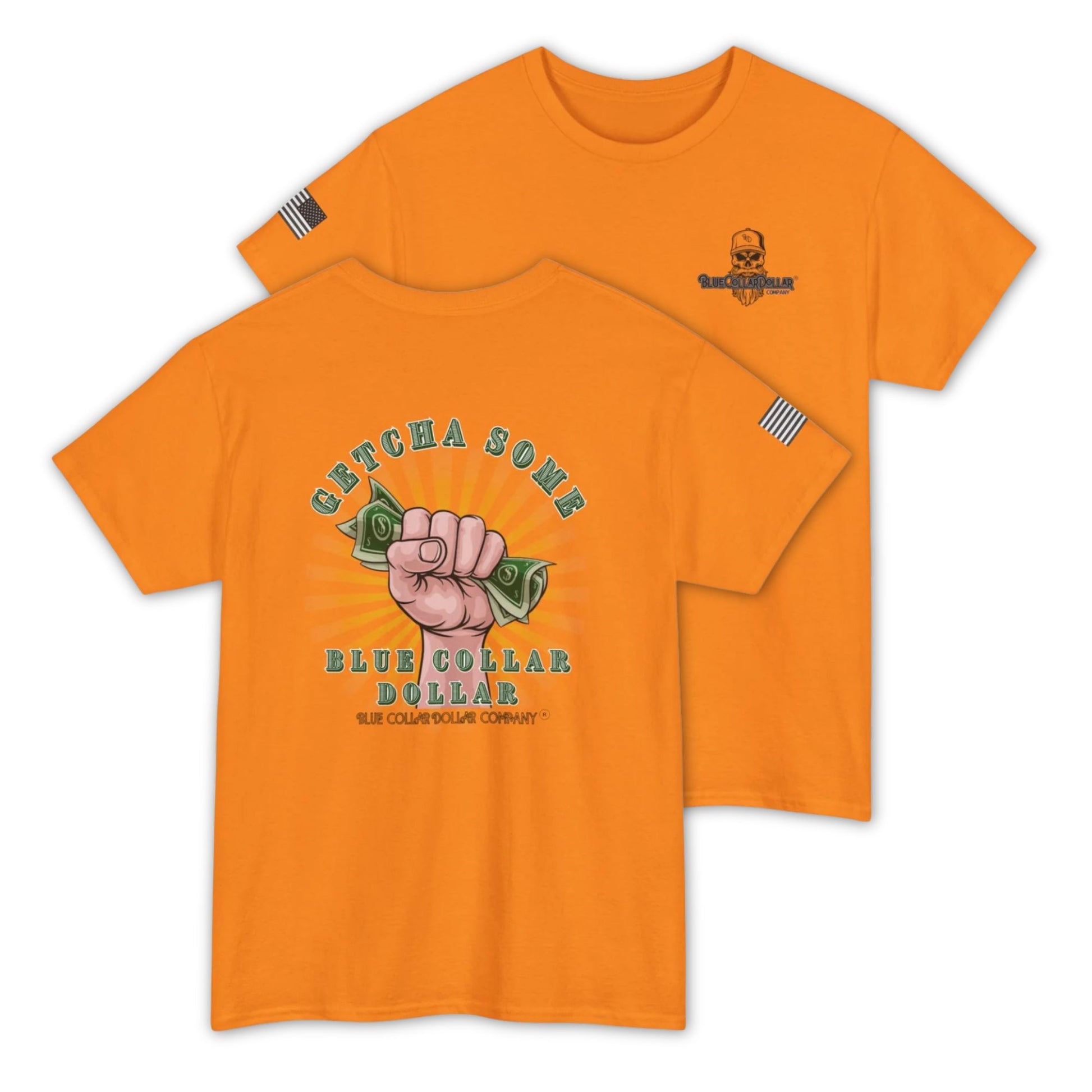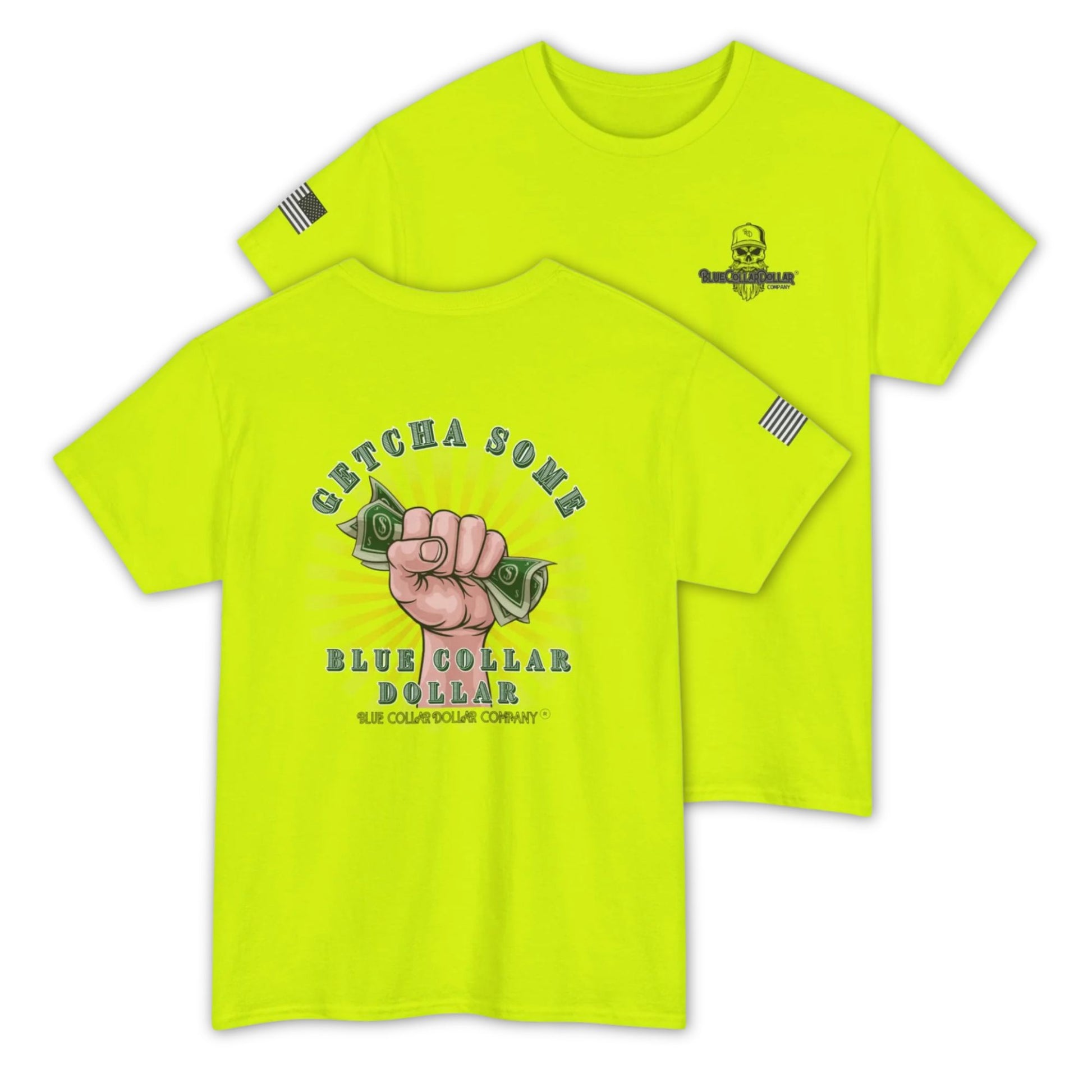 The “Getcha Some” hi-viz t-shirt isn’t just a shirt — it’s a battle cry for every blue-collar worker out there grinding for that paycheck, chasing that overtime, and building a life with their own two hands. With a clenched fist gripping a dollar bills and a burst of grit behind it, this design hits hard and loud: you earn what you get. A patriotic flag on the sleeve. Proudly stamped with Blue Collar Dollar front and center, this shirt represents more than just a brand — it’s a mindset. Hustle. Honor. Hard work. That’s what we’re made of.