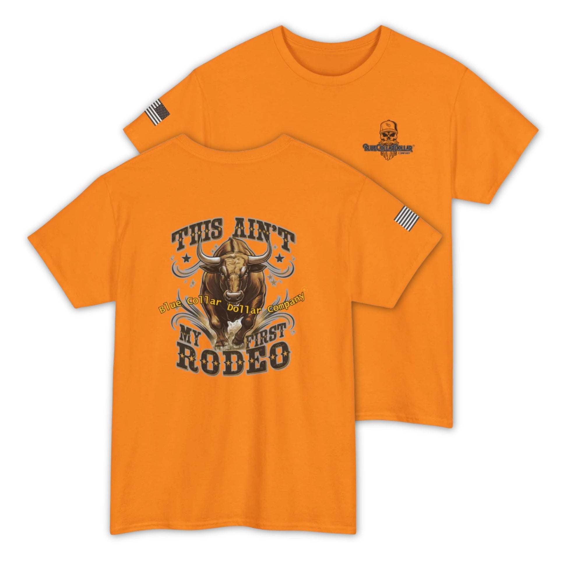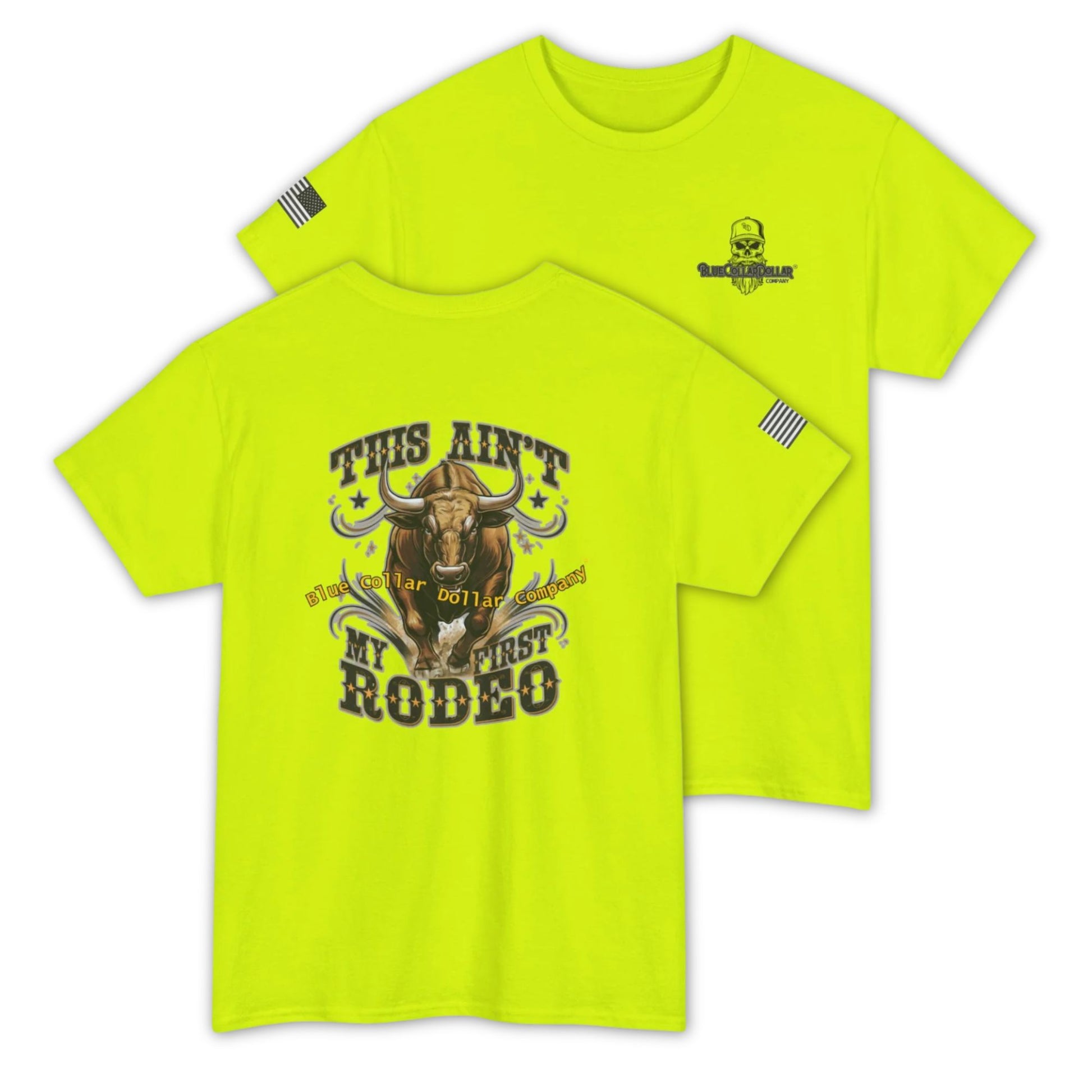 Front and center, a pissed-off bull charges across the chest, paired with bold “This Ain’t My First Rodeo” lettering so you stand out and stand tall. Available in high-visibility safety green or orange, it’s built for workers who don’t flinch when the job kicks back.
